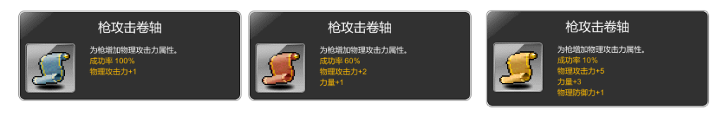 卷轴是强化装备的唯一途径. 按照成功率分为IMG_256100%, IMG_25660%和IMG_25610%. 10%IMG_256的卷对于装备的提升是最高的. 当然成功率是最低的.