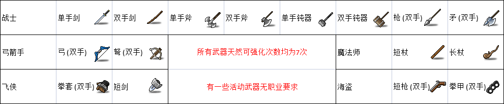 下方列出了每个职业可用的武器