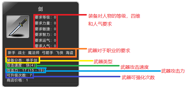 冒险岛中装备分为武器,防具和饰品. 每个装备都有属性和职业要求,全部达标了才能装备.