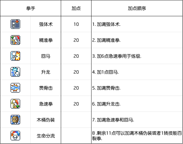 加1点回马便于聚集怪物,毕竟前期的拳手是全冒险岛最短手职业.