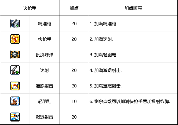 火枪手拥有全冒险岛最快基础武器攻速,优先加满精准枪便于增加最低攻击力.